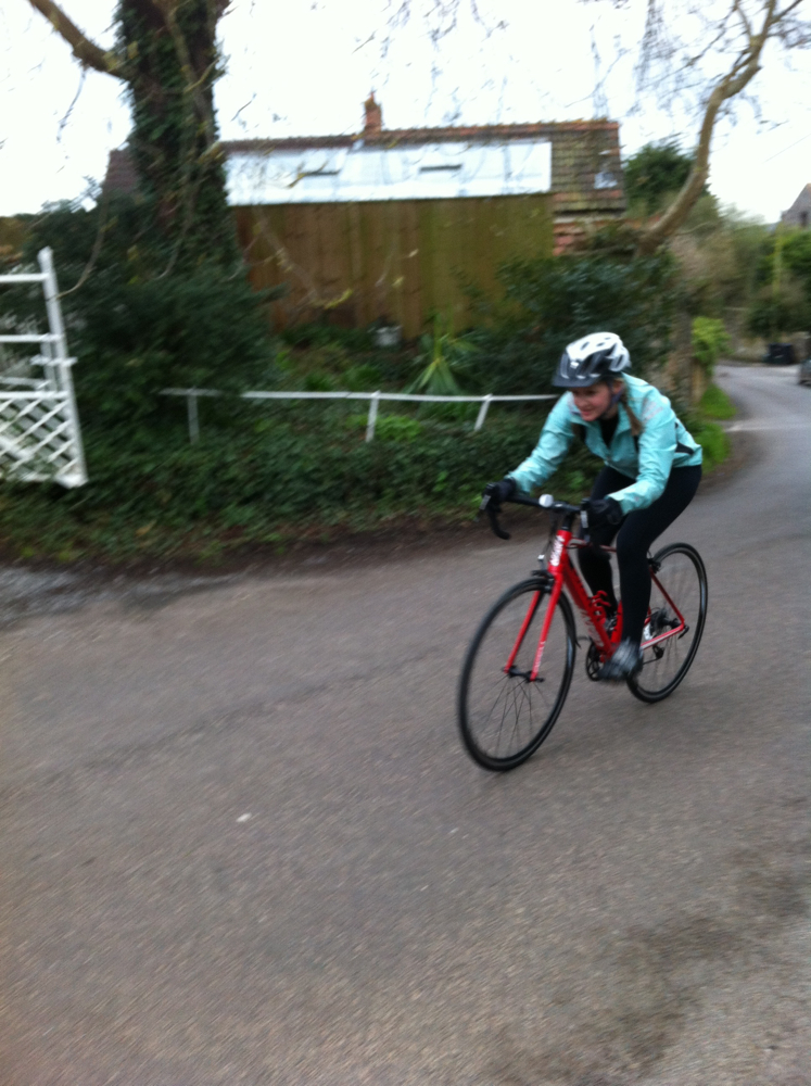Today I felt a little more in control of Rosie, despite the strong winds. I’m gradually getting used to the previously alien riding position and the super twitchy nature of a road bike. With a little more practice, I might even venture down onto the drops. But that’s for another day. For now, I’ll leave you with a somewhat fuzzy picture of me making my way up one of the many climbs on today’s ride: