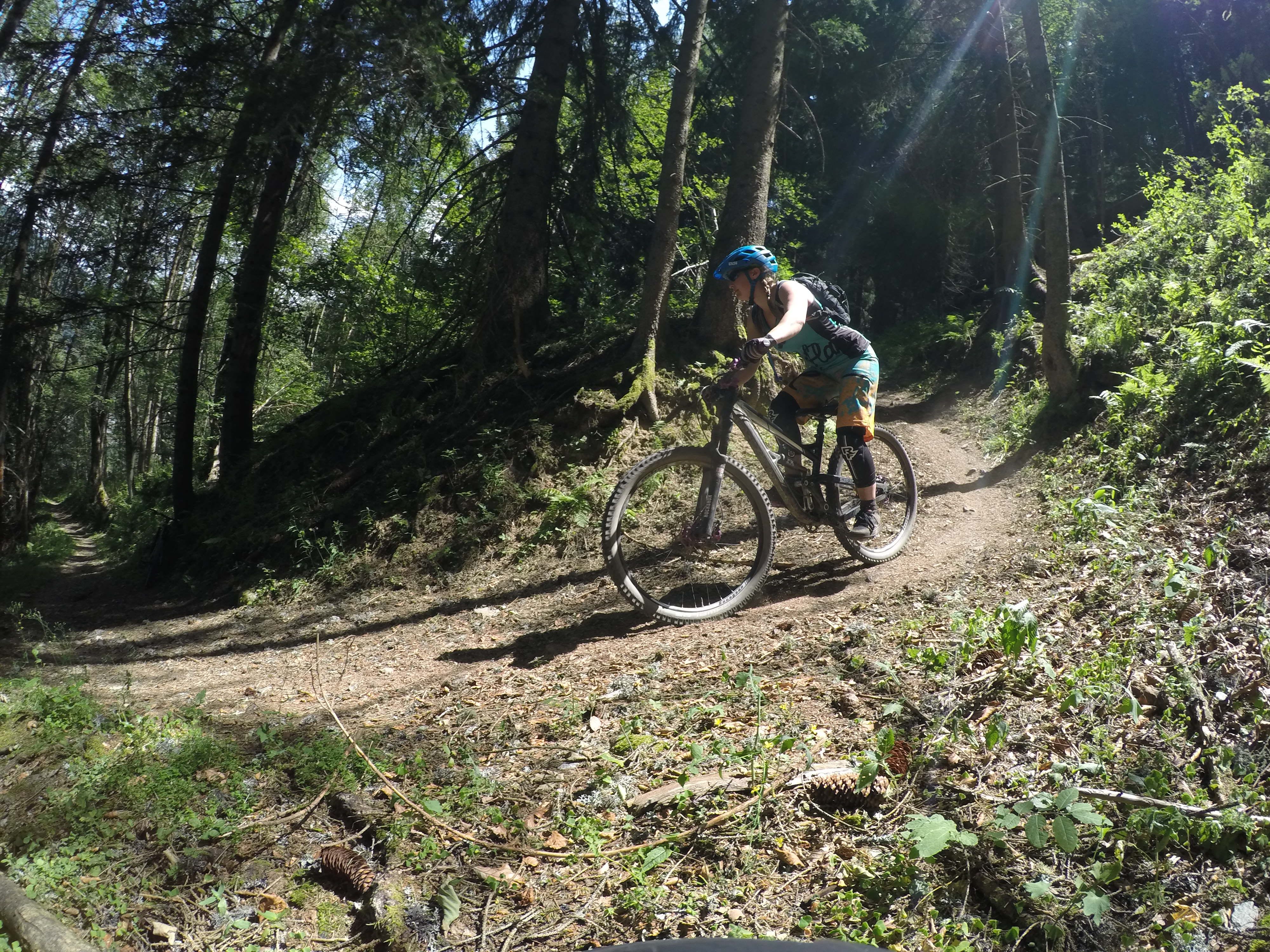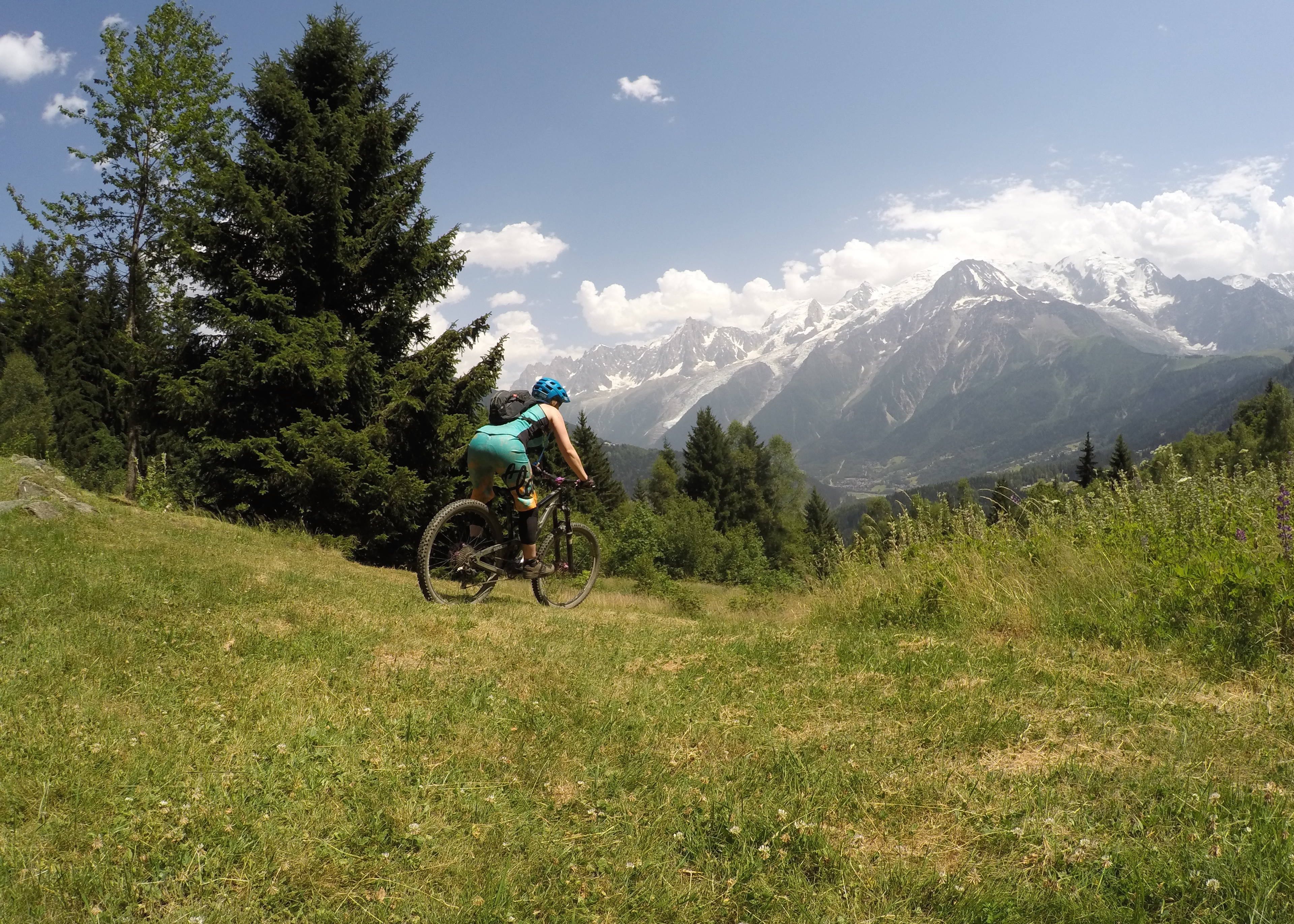 And the next day? Even more awesome! The guides split the group, so just Kat, the Mr and I went with George, whilst the Brummies headed off with Martin for a different ride. Our ride took us to yet more gorgeous singletrack, through woods, down steep, loose tracks and up sweaty climbs, as well as a few more chairlifts just for good measure. We paused in the woods to practice my switchbacks, which, by the way, I nailed (after some super coaching from George). My favourite section was named ‘Norwegian Wood’ and consisted of the most beautiful flowy singletrack through the trees. The trail just went on and on and spat us out in a clearing with a wonderful view of Mont Blanc. Never have I used the word awesome so fittingly.