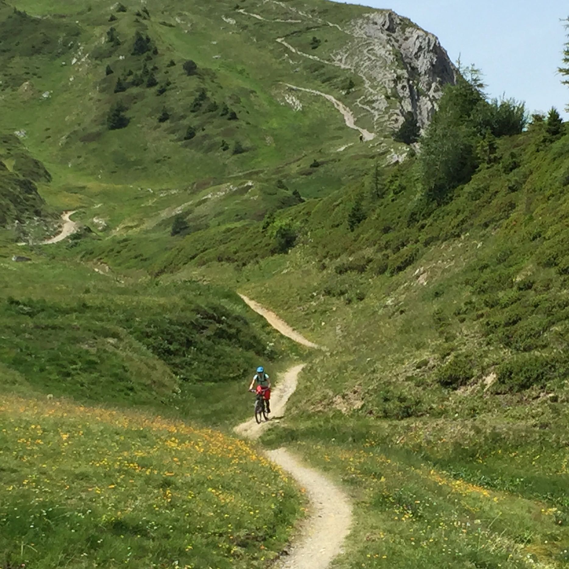 At the top we found a small bike park, which we rode to take us back down the mountain again. It was far more enjoyable than in Chatel, as we were pretty much the only people riding there and I started to feel a little happier on my bike again. Bike parks will never be my favourite kind of riding though, so I was relived to hear the guys in the group saying the same thing. The guides listened and so off we headed back up the chairlift to ride some of the most beautiful singletrack I have ever seen. We were riding singletrack that wended it’s way in and out of France and Switzerland, over the most luscious green mountains, with what were, quite simply, astounding views. There were switchbacks galore, with loose dusty terrain, and not a pyjama warrior in sight. I LOVED it.